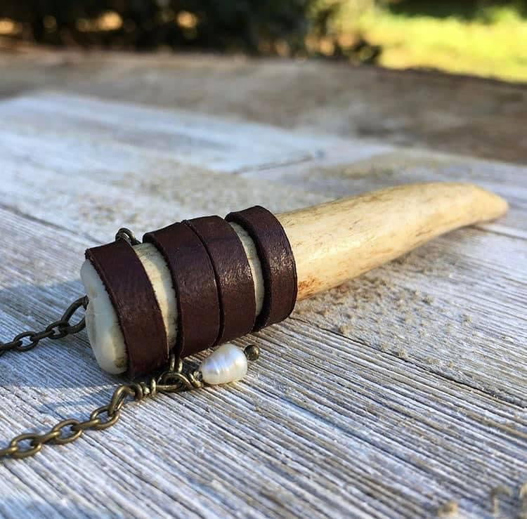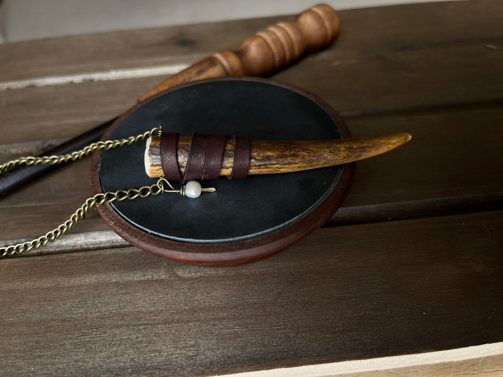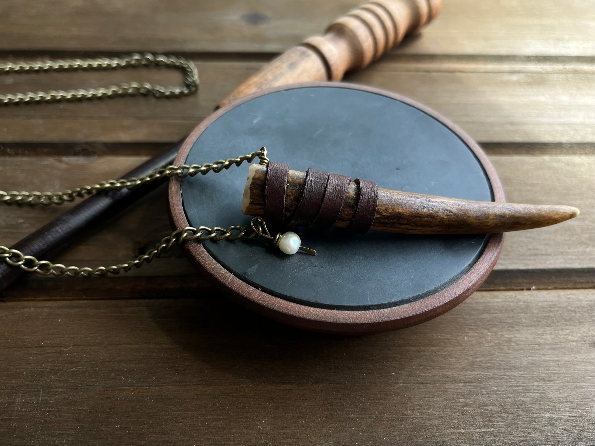 North American Whitetail antler shed wrapped in deerskin leather accented with a fresh water, baroque pearl on an antique brass chain / 28”