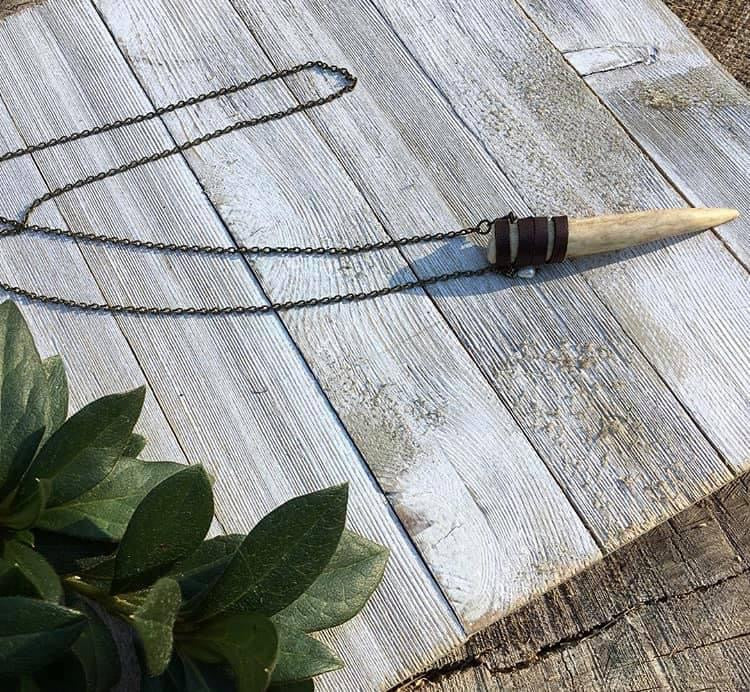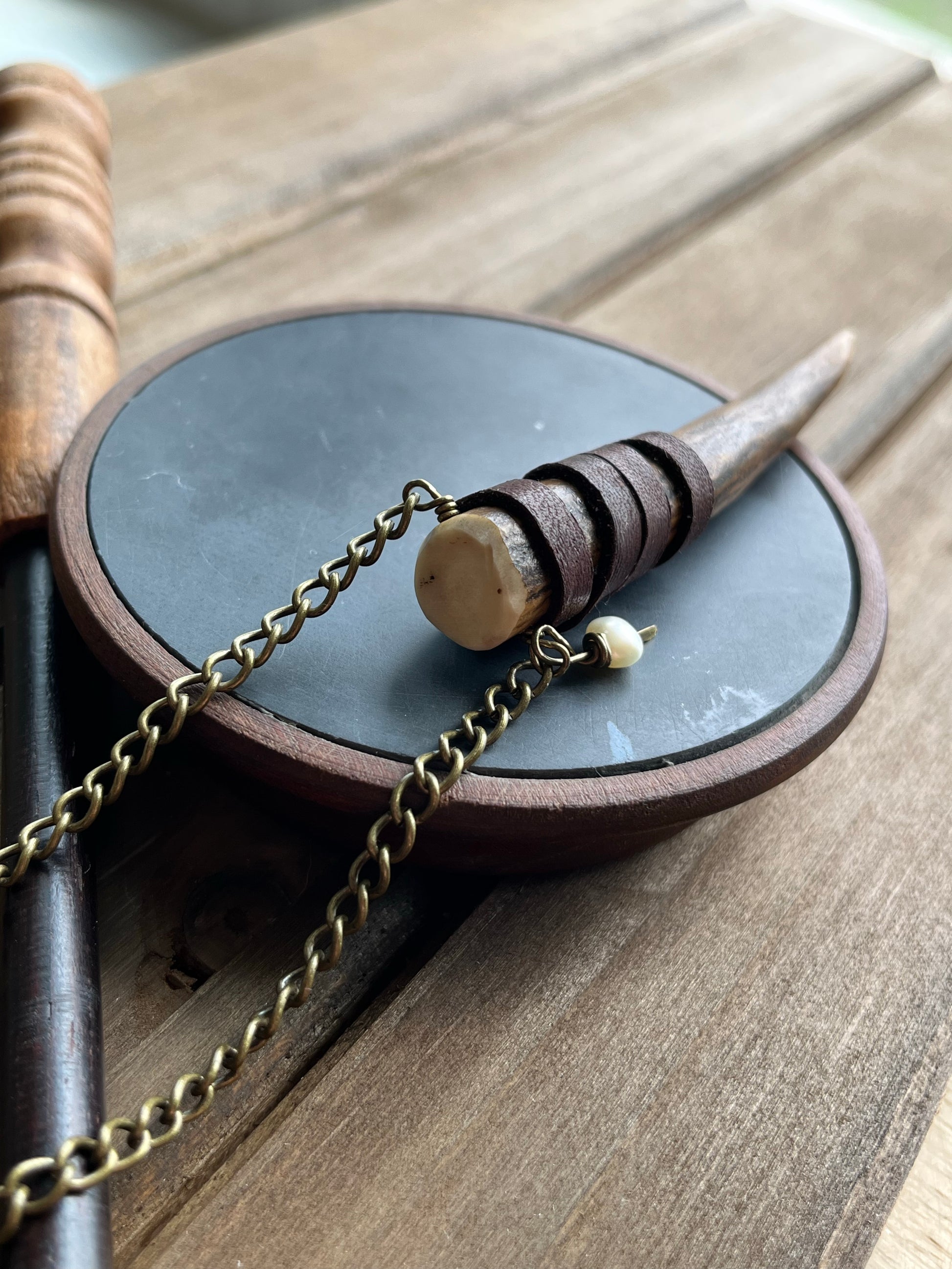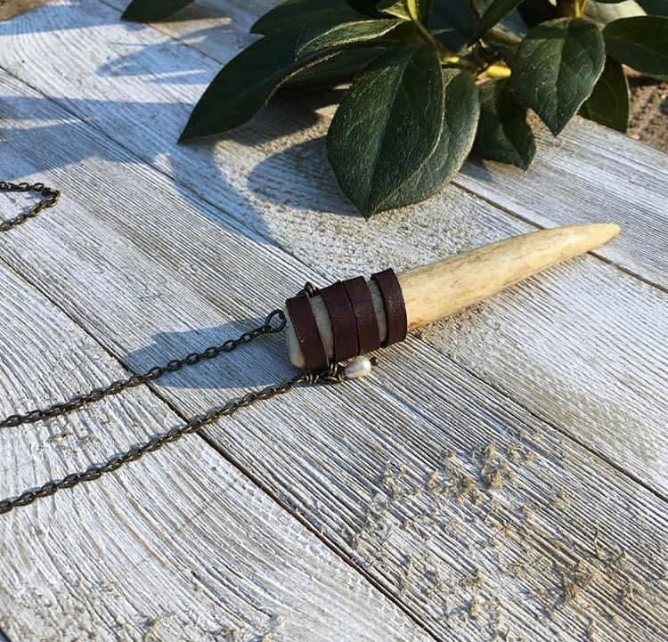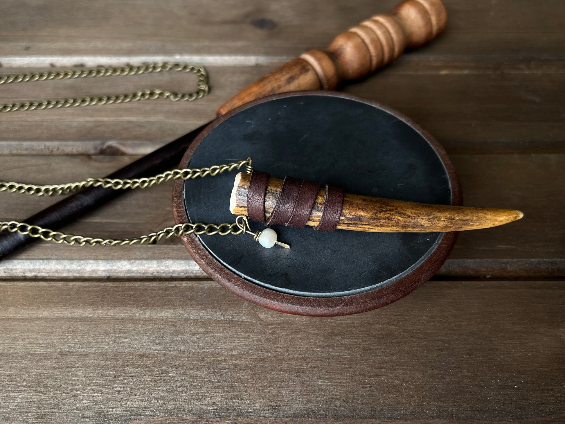 North American Whitetail antler shed wrapped in deerskin leather accented with a fresh water, baroque pearl on an antique brass chain / 28”