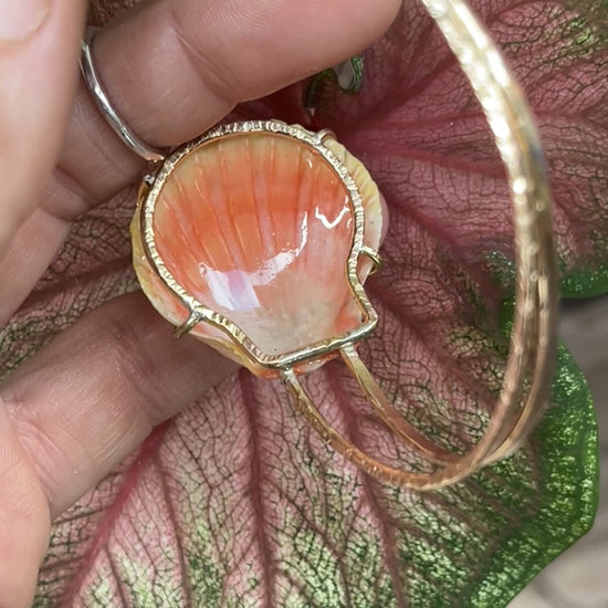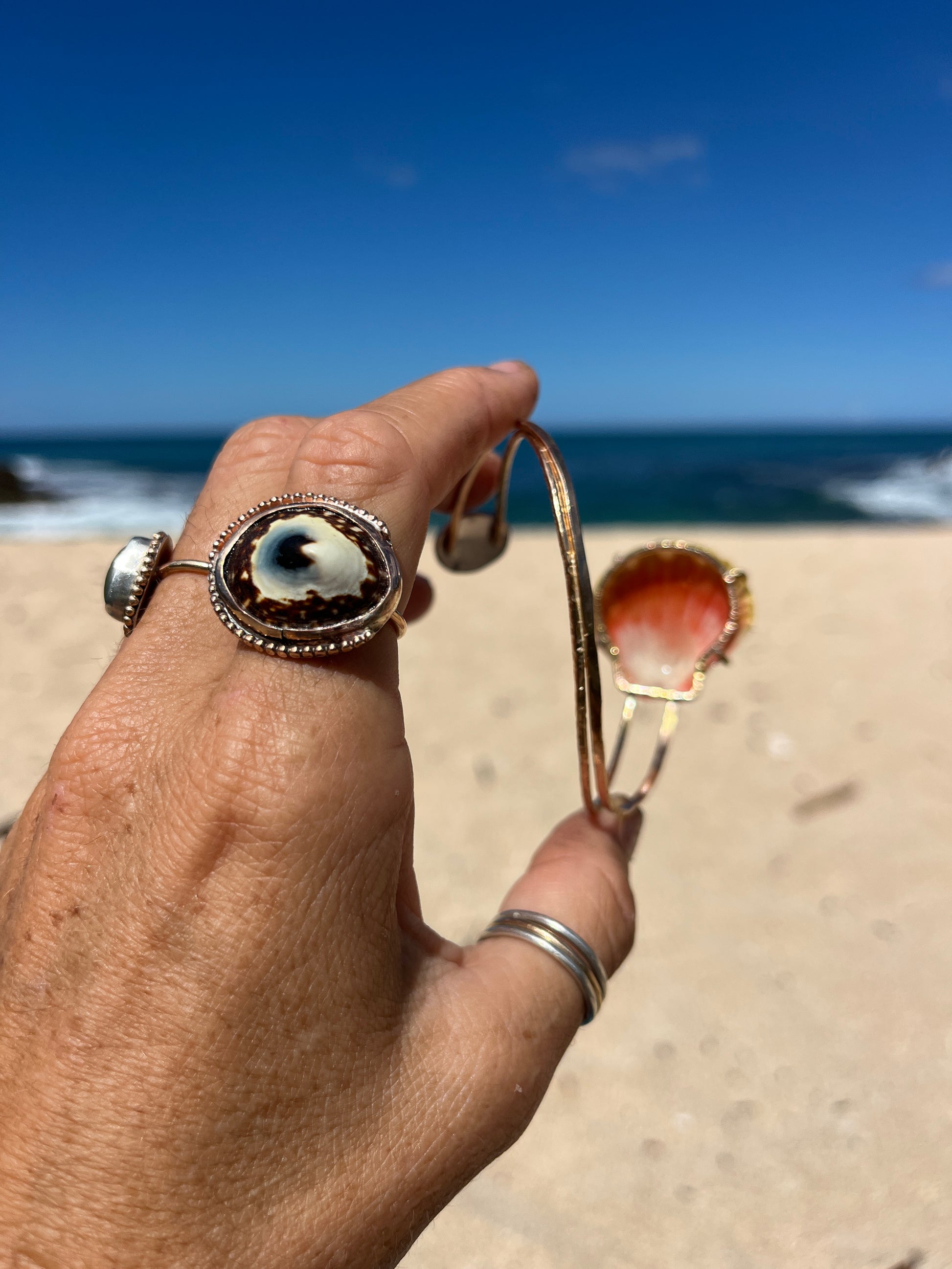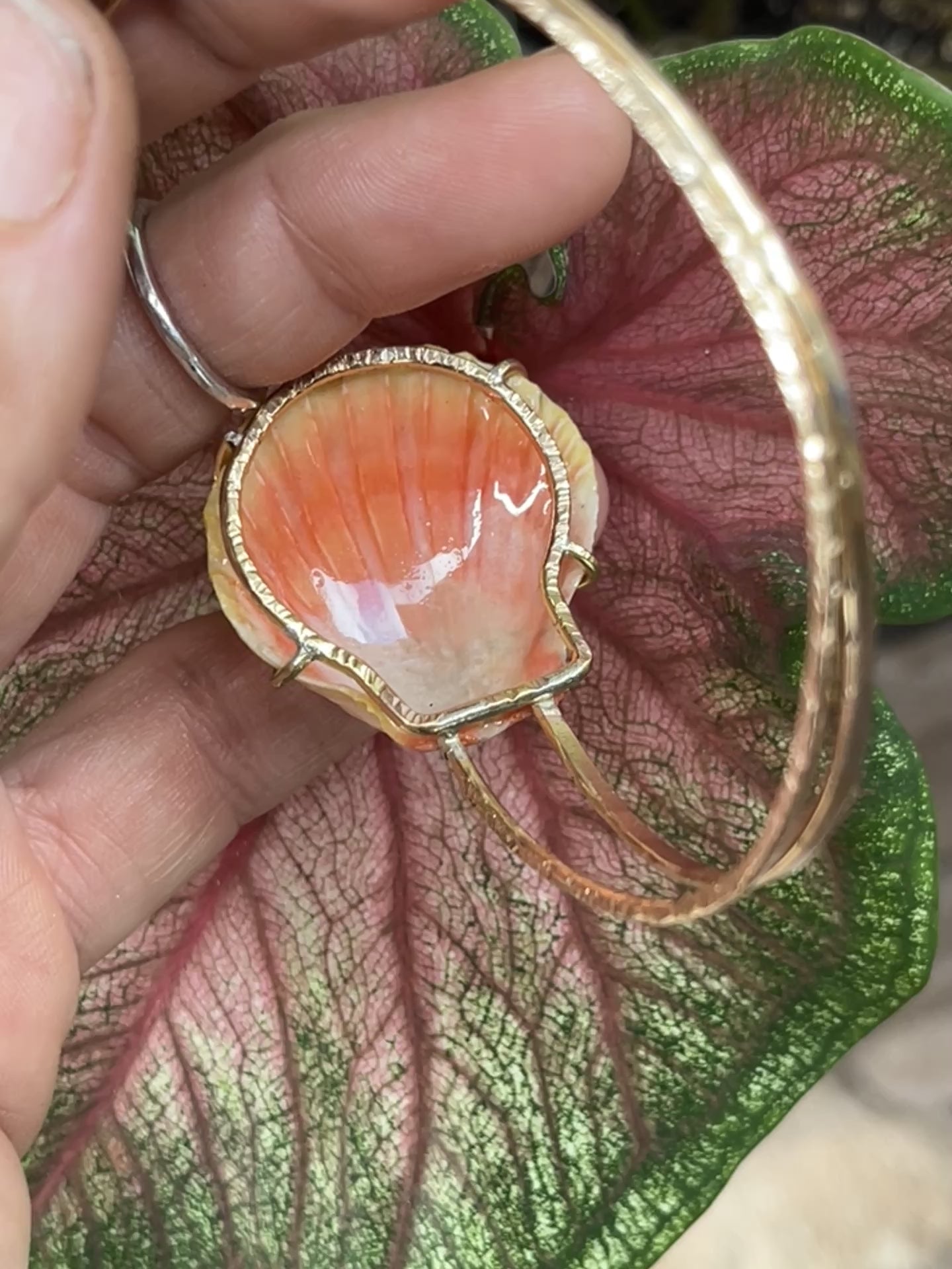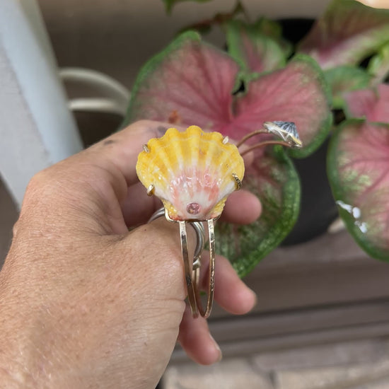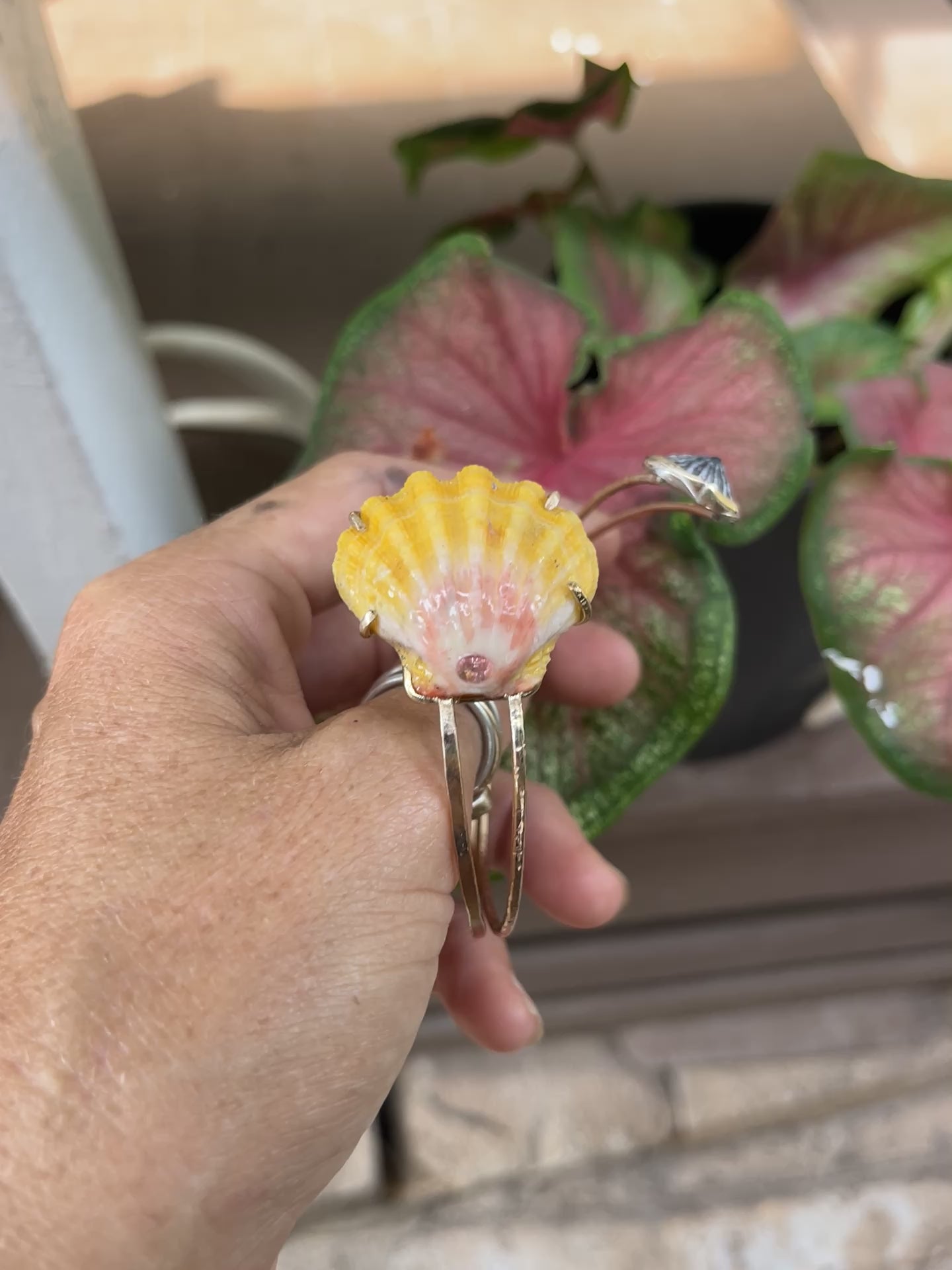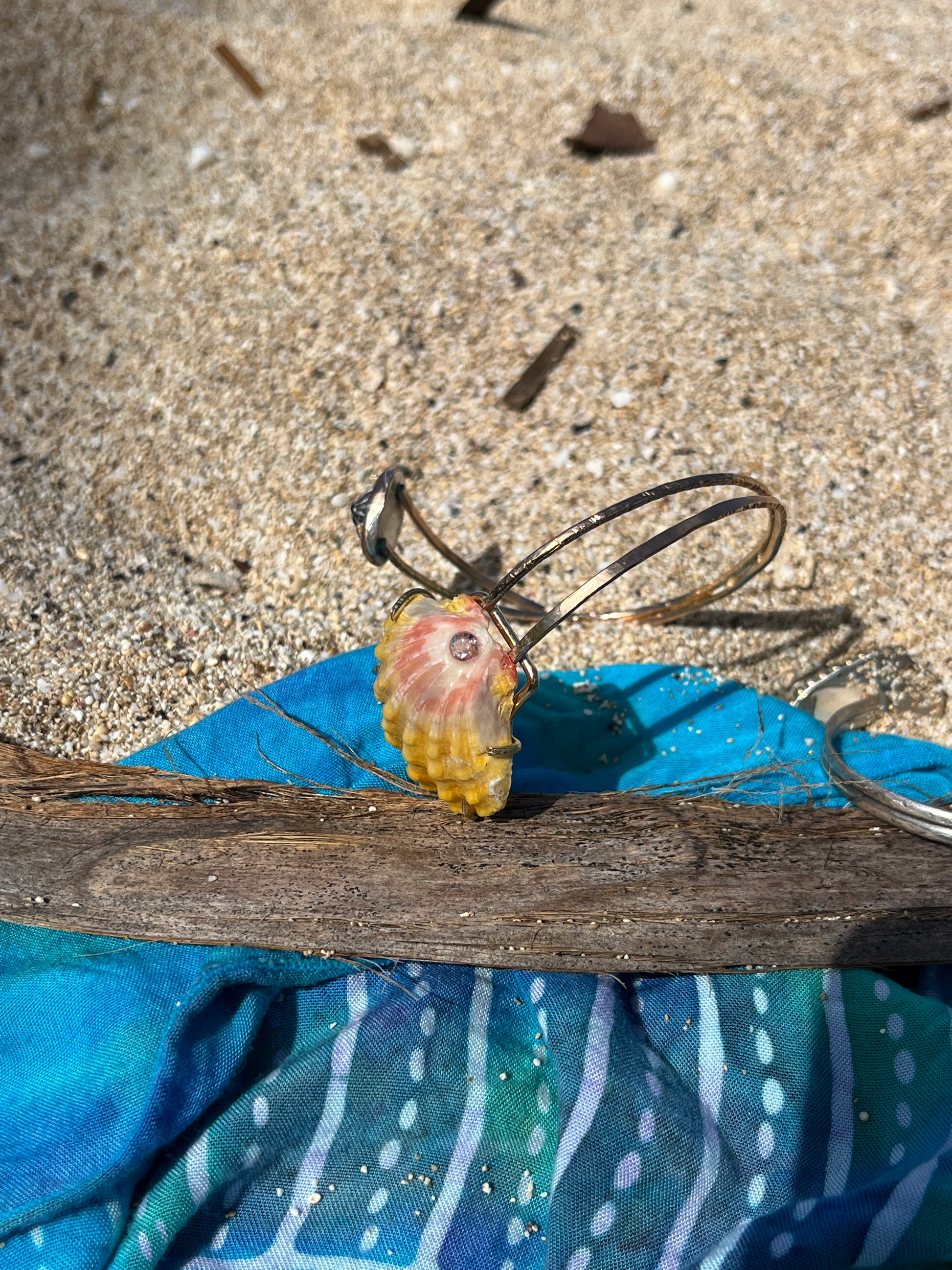 I was really stoked when I found this Sunrise Shell. It is honestly textbook; with it’s stunning, canary yellow, bumpy ridges full of character & it's soft pink hues at the base - this was the perfect candidate to inlay a princess cut piece of pink tourmaline. And the underside was just as stunning with an array of stunning pinks - so I have to prong set her! Paired with a false limpet shell (Hawalian 'Opihi) & Full Hard 14k gold filled wrapping bands; this is truly such a unique piece.