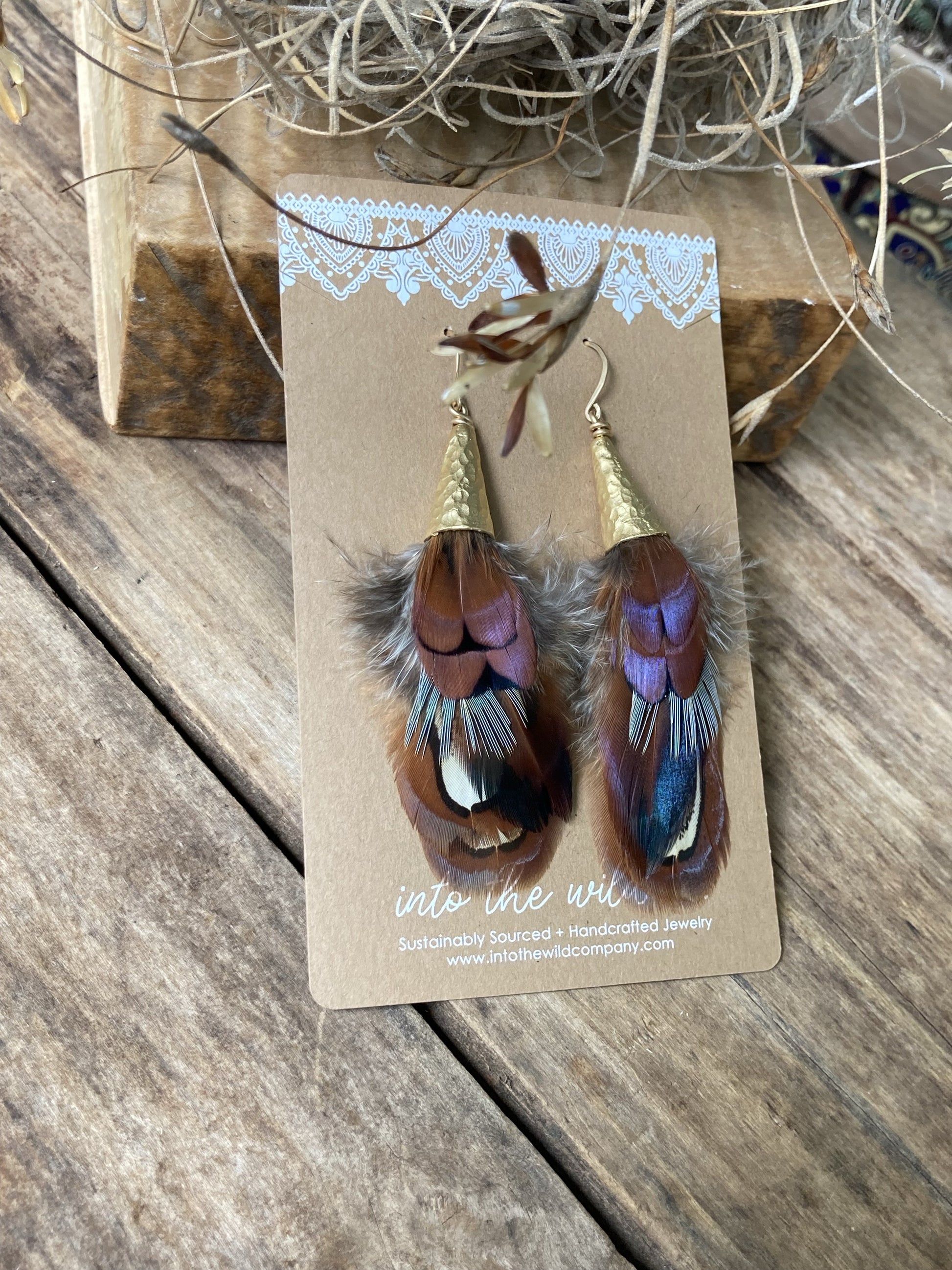 Pheasant feathers gently encased in 14kt gold filled caps & suspended from my smallest 14kt gold filled hammered horseshoe hoops